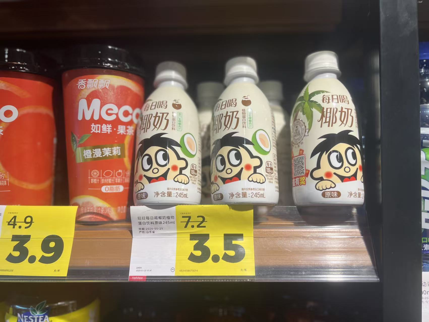 当然,好特卖这些饮料的最大区别在于日期不是最新,而它也会在价签旁边标注,比如只卖3.9元的柠檬共和国小青柠汁有效期还有不到半个月。