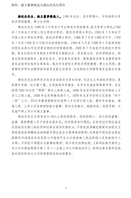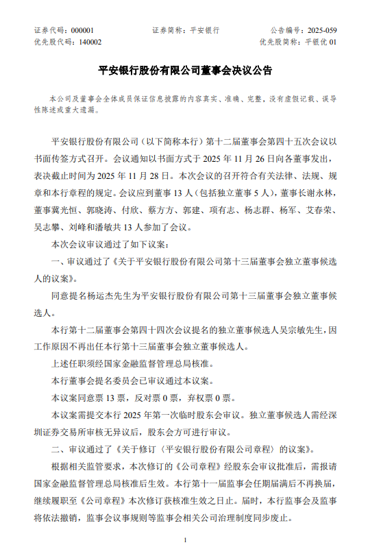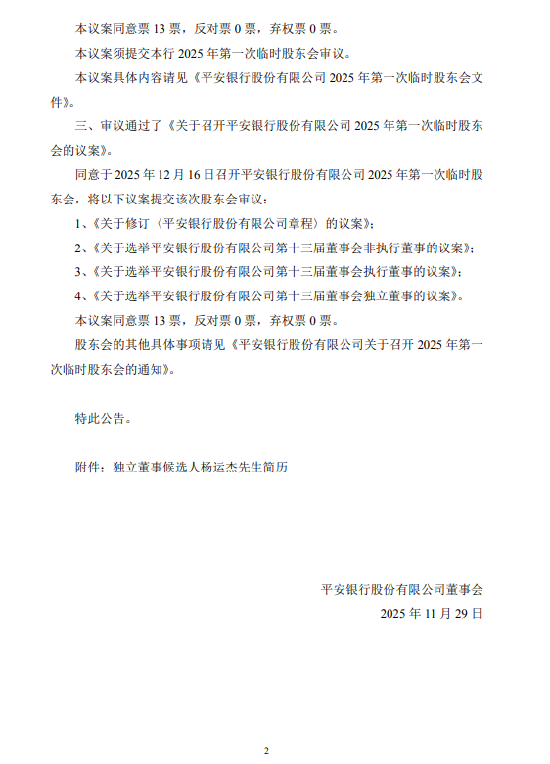 11月28日金融一线消息,公告,该行第十二届董事会第四十五次会议审议通过了《关于平安银行股份有限公司第十三届董事会独立董事候选人的议案》。 同意提名杨运杰先生为平安银行第十三届董事会独立董事候选人。上述任职须经国家金融监督管理总局核准。该议案需提交该行 2025 年第一次临时股东会审议。独立董事候选人需经深圳证券交易所审核无异议后,股东会方可进行审议。
