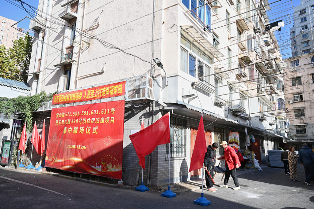 11月29日上午,位于上海静安区的宝山路571、581、591、601、611号及东宝兴路490号旧住房改造项目集中搬场仪式举行。10辆扎着大红绸花的搬场车整齐列队,腰鼓队奏响激昂的鼓点,居民们接过捧花登上搬场车。