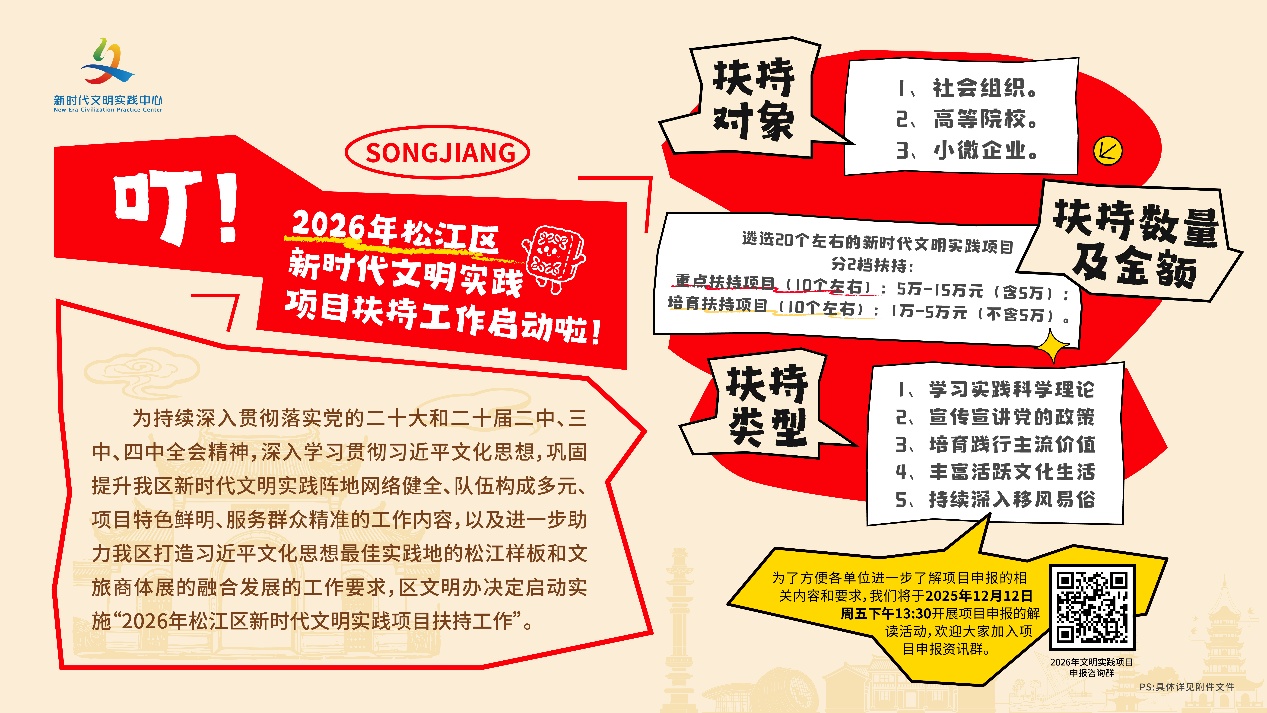 从浦江之首的文化传承到天马星空的科幻探索,从城市社区的精准服务到乡村田野的文明浸润,松江区新时代文明实践工作正以多元的形式、丰富的内涵、务实的举措,让文明之花绽放在城市的每个角落。未来,松江区将对标“先进制造业发展集聚区、新质生产力发展先行区、现代化新城建设样板区、乡村全面振兴示范区”的功能定位,持续深化文明实践内涵建设,推动文明实践与城市发展同频共振、与群众需求精准对接,让文明成为松江最鲜明的城市底色、最深厚的发展底蕴,为奋力建设现代化新松江贡献文明力量。