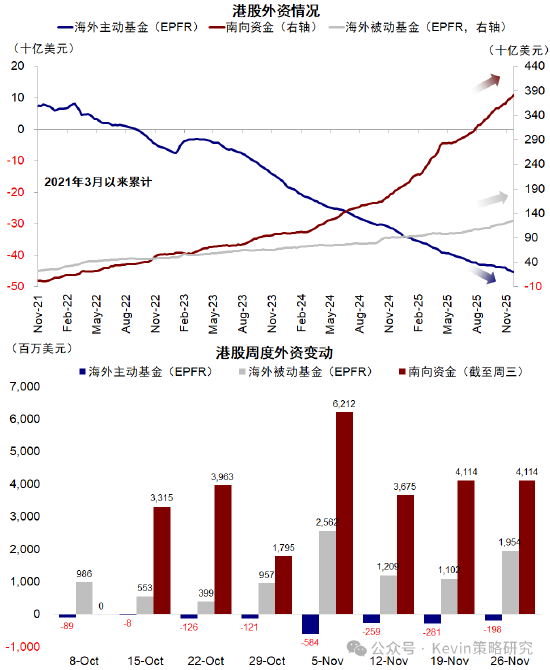 被动外资加速流入A股8亿美元(vs. 上周流入0.2亿),流入港股19.5亿美元(vs. 上周流入11亿)。