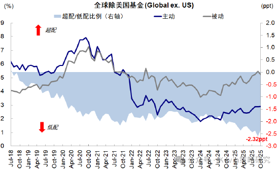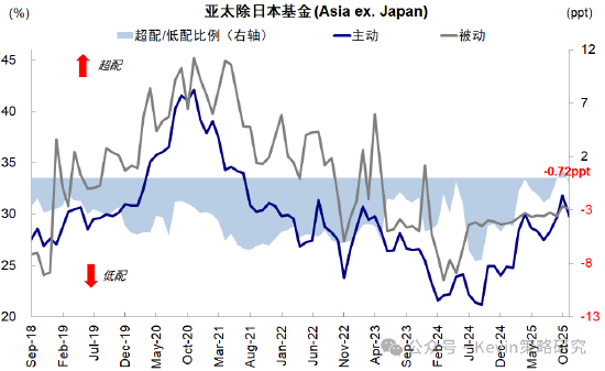 截至10月,主动外资对中国配置比例从9月7.2%降至6.9%,被动比例从9月8.6%降至8.2%,低配程度从9月1.37ppt缩窄至1.28ppt。其中,亚洲除日本基金从9月超配转为低配,新兴和全球除美国基金低配程度收窄。