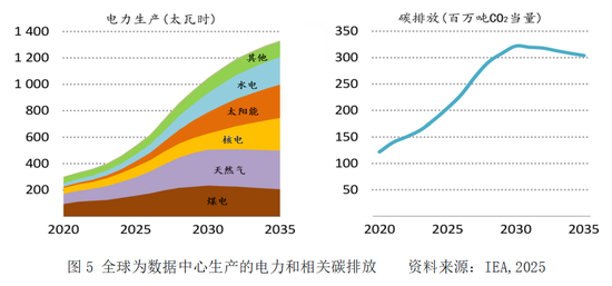 IEA报告显示,全球数据中心生产需要的电力预计将从2024年的460太瓦时(4600亿度)增加至2030年的1000太瓦时和2035年的1300太瓦时(13000亿度),假设2024 ~ 2030年增加的电力中一半来自可再生能源,其余来自煤炭和天然气,2030 ~ 2035年新增电力主要通过核电解决,则2030年全球数据中心的碳排放将达到3.2亿吨的峰值,2035年随着核电和其他可再生能源的普及,全球数据中心的碳排放有望回落至3亿吨,如图5所示。按照绿色和平组织报告,以AI数据中心耗电量占全部数据中心耗电量53%测算,到2030年AI数据中心的碳排放约为1.696亿吨[这与绿色和平组织测算的1.66亿吨相当接近(见图6)]。我国三大航空公司披露的2024年碳排放(只披露范围1和范围2排放,未披露范围3排放)合计为8112.39万吨CO2当量(其中国航2788.2万吨、南航2927.06万吨、东航2397.13万吨),这意味着,2030年全球AI数据中心的碳排放相当于我国三大航空公司2024年碳排放总和的209%。而根据All About AI的数据可知,截至2025年8月的12个月里,美国AI和其他数据中心的碳排放占美国碳排放总量的2.18%,略微超过美国航空业同期的碳排放占比。