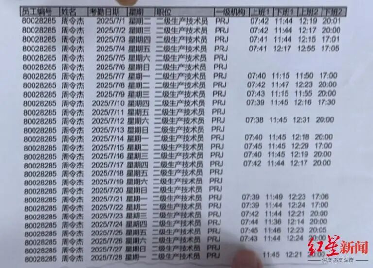 周令杰哥哥告诉红星新闻记者,为了了解弟弟的工作强度,他们获取了其从7月1日至28日的打卡考勤记录,显示28天里,周令杰有双休或调休,考勤的20天中,每天早上约7:40上班,中午11:45至12:20左右休息,但下班时间不一。其中7天在17:00或17:30下班,其余13天均在20:00下班。