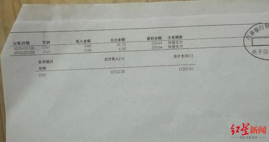 此外,家属至今对周令杰的薪资情况也不了解。他们调取了周令杰从4月1日之后的招行工资卡流水记录。红星新闻记者看到,5月中旬,该账号入账两笔钱,共2467元;6月10日入账3368元;7月入账七笔钱,除7月10日3983元、13日1000元外,其余均为数十至几百的小额收入,本月收入6780余元。但周令杰也一直有支出,多为“快捷支付”。